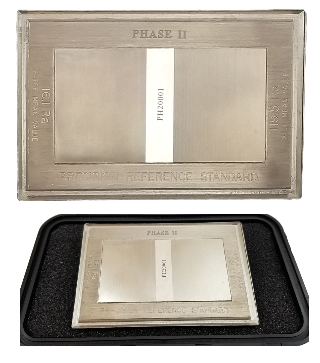 The Phase II Reference Standard provides a reliable calibration tool which permits the technician to calibrate surface analyzing equipment to its peak efficiency. The SRG4600-500 shows the actual patch mean values of low and high microinch surfaces